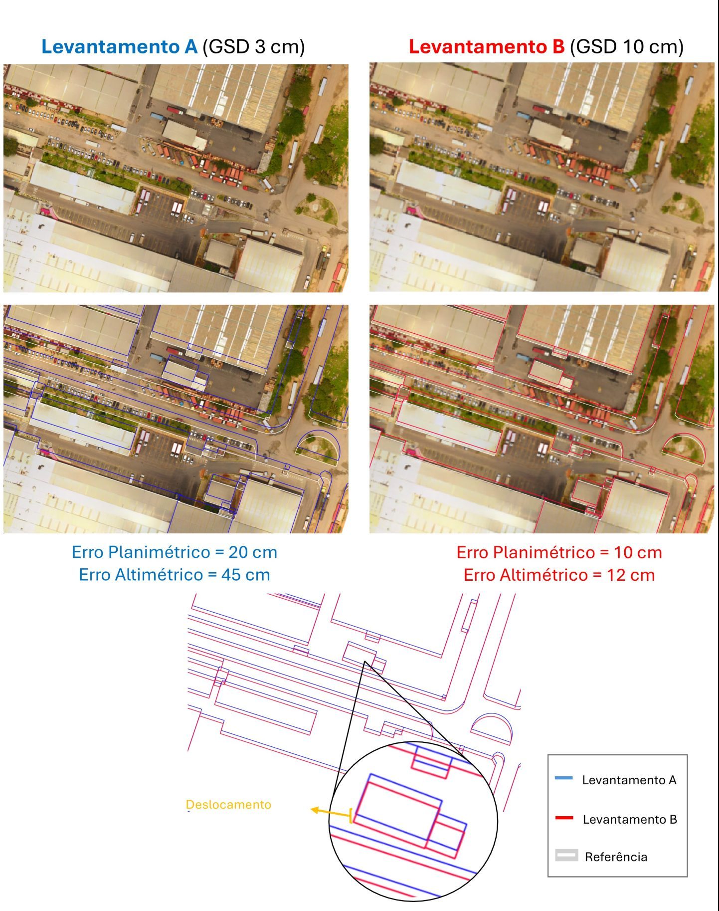 Veja o exemplo representado na figura abaixo. Mesmo apresentando um GSD significativamente menor (3 cm), um levantamento realizado sem a devida metodologia pode resultar em erros planimétricos da ordem de 20 cm e altimétricos próximos de 45 cm, tornando-o tecnicamente inadequado para aplicações de engenharia. Em contraste, um levantamento com GSD maior (10 cm), porém tomados os devidos cuidados, pode atingir erros planimétricos em torno de 10 cm e altimétricos próximos de 12 cm, demonstrando que a confiabilidade do produto está diretamente relacionada ao método e ao controle adotados, e não apenas ao nível de resolução das imagens.