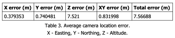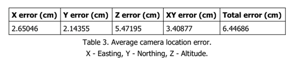 A imagem abaixo representa o erro médio de localização da câmera (drone), ou seja, o erro do GNSS de navegação do drone, sendo 38 cm em X, 74 cm em Y e 7,5 metros em Z.