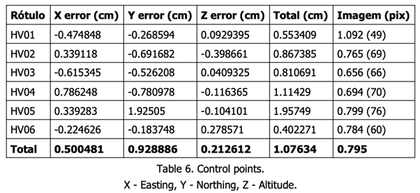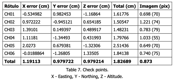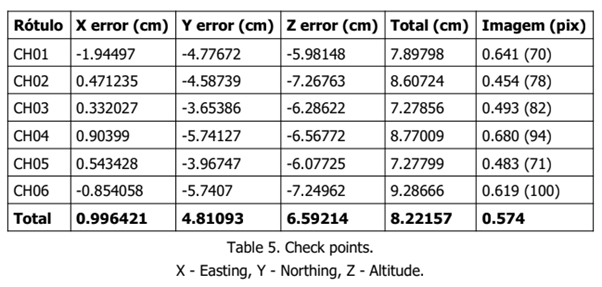 A tabela a seguir apresenta os resultados de acurácia obtidos nos pontos de verificação. Diferentemente dos pontos de controle, os pontos de verificação não participam do processamento das imagens (ajustamento de observações) e, portanto, não sofrem qualquer influência desse processo.