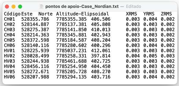 Figura 4: Arquivo .txt com as coordenadas UTM de cada ponto e suas precisões (RMS)