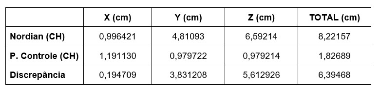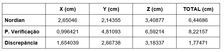 A acurácia dos pontos de verificação ficou bem próxima da acurácia das câmeras apresentadas anteriormente, isso mostra que de fato o sistema NTRIP Nordian tem um bom desempenho apresentando acurácia centimétrica, a tabela a seguir apresenta a discrepância entre os dois métodos: